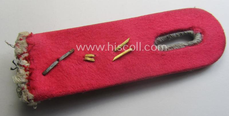 This is an attractive - albeit regrettably single! - neatly 'cyphered', officers'-type shoulderboard having the (bright!) pink-coloured branchcolour as was specifically intended for usage by an: 'Oberleutnant des Panzerjäger-Abteilungs 6' (or: lieutnant-first-class who served within a specific anti-tank- ie. tank-destroyers' regiment, numbered: '6') and that comes in an overall nice- (albeit I deem moderately used ie. worn- and/or I deem carefully tunic-removed-), condition. The shoulderboard which is approximately 11 cms. sized in length and that is piped in the neat bright-pink- (ie. 'rosaroter'-) coloured branchcolour as to be expected shows a neat (bright golden-coloured, 'Buntmetall'-based, Gothic-styled- and/or: smaller-sized) so-called: 'P'-cypher (ie. 'Ziffer'), smaller-sized '6'-numeral and equally-styled (and larger-sized) pip period-attached denoting that the strap was intended for a junior-officer who held the rank of an: 'Oberleutnant' (ie. lieutnant-first-class). All three devices show some regular age and/or minimal tarnish but are both still nicely preserved. The strap never had a tongue attached (it is a typical specimen of the 'sew-in'-type) and does show some minimal age, wear and/or staining (as can be seen on the pictures). The piece was never before in collectors'-hands and was recently found as such. Simply an attractive 'Heeres' officers'-type shoulderstrap that belonged to an: 'Oberleutnant des Panzerjäger-Abteilungs 6': too bad that it is only a single specimen!
