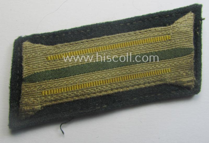This is a neat - clearly tunic-removed and fully matching! - pair of - I deem - early-war period, WH (Heeres) 'M36' (ie. 'M40'-) type collar-patches (ie. 'Einheitskragenspiegel') as piped in bright-yellow- (ie. 'zitronengelbener'-) coloured branchcolour as was specifically intended for usage by a: 'Soldat der Nachrichten-Truppen' (or: soldier ie. NCO who served within an army signals unit ie. regiment) and that comes in an overall nice- (ie. clearly used and/or carefully tunic-removed-), condition. The tabs have the desirable bright-yellow- (ie. 'zitronengelbener'-) coloured branchcolour signifying that they were intended for a soldier (ie. NCO) who served within an army signals-unit. Both tabs are nicely constructed in so-called: 'BeVo'-weave-pattern and are mounted onto a darker-green-coloured- and/or (typical) woolen-based 'background' as more often seen (as can be seen on the pictures). The pair shows the neat 'buckram'-based backings as is more often encountered and still shows some of the thread- and/or stitching-remains with which it was once tunic-attached (as can be seen on the pictures). Simply a great occasion to acquire a neat - and actually not that easily encountered! - 'M36' (ie. 'M40'-) type collar-tab-set in a desirable branchcolour ie. 'Waffenfarbe'!