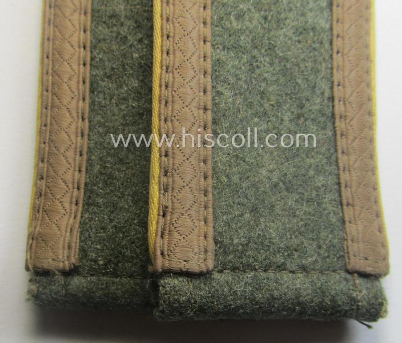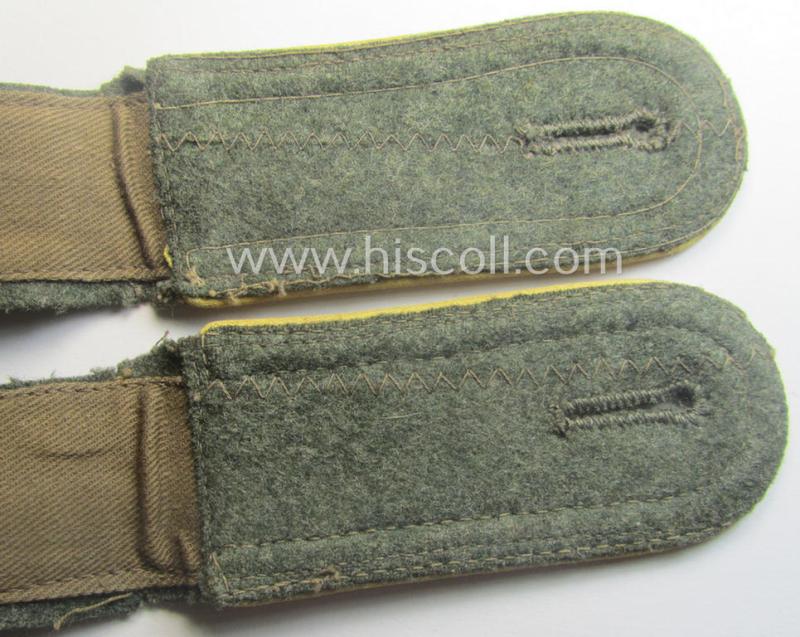 This is a truly attractive - and fully matching and actually not that easily found! - pair of WH (Heeres) early- (ie. mid-) war-period, so-called: 'M40- o. M43'-pattern, NCO-type shoulderstraps having the neat bright-yellow- (ie. 'zitronengelber'-) coloured branchcolour as was specifically intended for - and clearly worn by! - an: 'Unteroffizier eines Heeres Nachrichten-Abteilungs' (or: junior-sergeant who served within an army-signals unit) and that comes in an overall very nice- (albeit minimally used ie. worn-), condition. The shoulderstraps - which measure approximately 10,6 cms. in length each - have the 'standard-type'- and/or field-grey-coloured, woolen-based 'upperdecks'. The straps - which have the bright-yellow- (ie. 'zitronengelber'-) coloured- and/or desirable 'silk-like'-type piping attached - show the ('standard-issue'-pattern, greyish-blue-coloured ie. typically 'sub-dued') NCO-braid period-attached denoting that the NCO who wore this pair held the rank of an: 'Unteroffizier' (as can be seen on the pictures). The straps - which came mounted onto their functional tongues - show as stated above some minimally usage and/or wear only (some minor staining and/or dust is visible and/or present). Simply an attractive and/or: early- (ie. mid-) war-period, 'Heeres'-related NCO-type shoulderstrap-pair that was intended for usage by an: 'Unteroffizier eines Heeres Nachrichten-Abteilungs' and that is I deem accordingly priced!