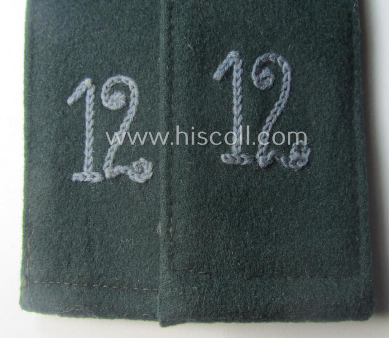 This is a truly attractive - fully matching and with certainty quite scarcely found! - neatly 'cyphered' and/or pointed-styled, WH (Heeres) early- (ie. pre-war-) period- (ie. so-called: 'M36 o. M40'-pattern) enlisted-mens'-type shoulderstraps (ie. 'Schulterstücke für Mannschaften des Heeres') being a pair having no branchcolour ie. piping as per regulation as was specifically intended for usage by a: 'Soldat des Nachschub-Abteilungs 12' (or: simple soldier who served within the army transport-unit, numbered: '12') and that comes in an overall very nice- (ie. I deem just minimally used- and most certainly worn- and/or carefully tunic-removed-), condition. The neat straps - which have the 'standard'-pattern, darker-green-coloured and/or 'smooth woolen'-based 'upperdecks' and that measure approximately 12,4 cms. in length each - are as per regulation void of any piping as always (as can be seen on the pictures). The straps come mounted onto their functional tongues and show the neat (machine-embroidered by means of so-called: 'Kurbelstickerei') '1'- and/or '2'-numerals (ie. 'Ziffern') (which are executed in the bright-blue- ie. 'kornblumenblauer'-coloured wool ie. linnen as to be expected). The straps do only show minimal wear and/or age and are just very nicely preserved (as can be seen on the pictures). I deem this an excellent occasion to acquire a neat - and most certainly very desirable and quite rarely found! - neatly 'cyphered', EM-type 'Nachschub'-related shoulderstrap-pair for a justified price!