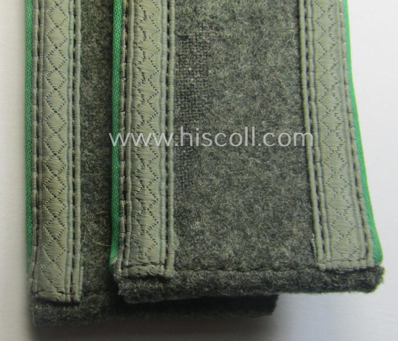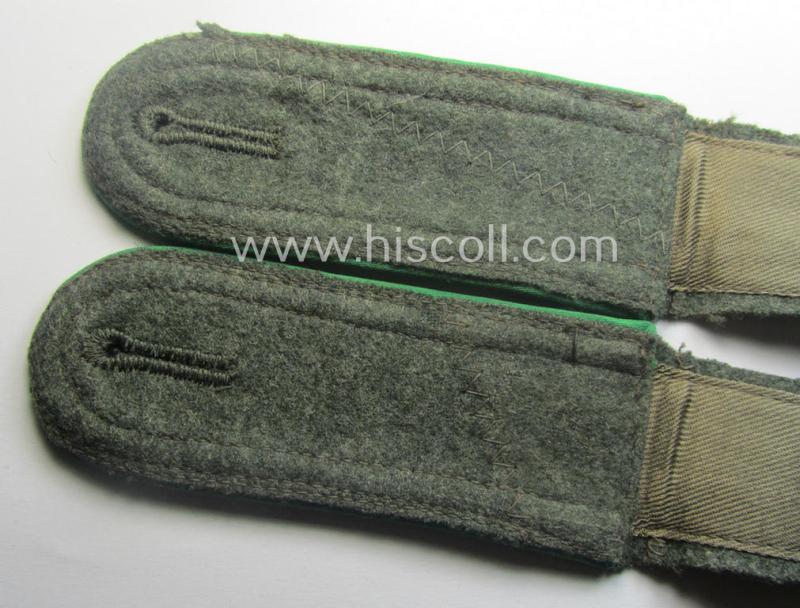 This is a very attractive - fully matching and actually truly very scarcely found! - pair of WH (Heeres) early- (ie. mid-) war-period, so-called: 'M40- o. M43'-pattern NCO-type shoulderstraps as piped in the darker-green- (ie. 'grüner'-) coloured branchcolour as was intended for - and minimally worn by! - an: 'Unteroffizier eines Gebirgsjäger- o. Jäger-Regiments' (or: NCO and/or junior-sergeant who served within an army mountain-troops-regiment) and that comes in an overall very nice- (albeit moderately used ie. worn- ie. carefully tunic-removed-), condition. The regular-sized shoulderstraps - which are approximately 12,4 cms. sized in length - shows the bluish-grey-toned (ie. sub-dued) NCO-braid attached and have the 'standard-type'- and/or field-grey-coloured, woolen-based 'upperdecks'. The straps - which have the the darker-green- (ie. 'grüner'-) coloured- and/or (desirable!) 'silk-like'-type piping attached - came mounted onto their functional tongues and do show as stated above just minimal usage and/or wear (some minor staining and/or dust is visible and/or present). It should be noted that all 'Gebirgsjäger o. Jäger'-related, WH (Heeres) NCO-type shoulderstraps can easily be regarded 'truly scarce'. Simply an attractive and/or: early- (ie. mid-) war-period, 'Heeres'-related NCO-type shoulderstrap-pair that was intended for usage by an: 'Unteroffizier eines Gebirgsjäger- o. Jäger-Regiments'!