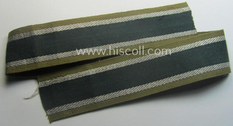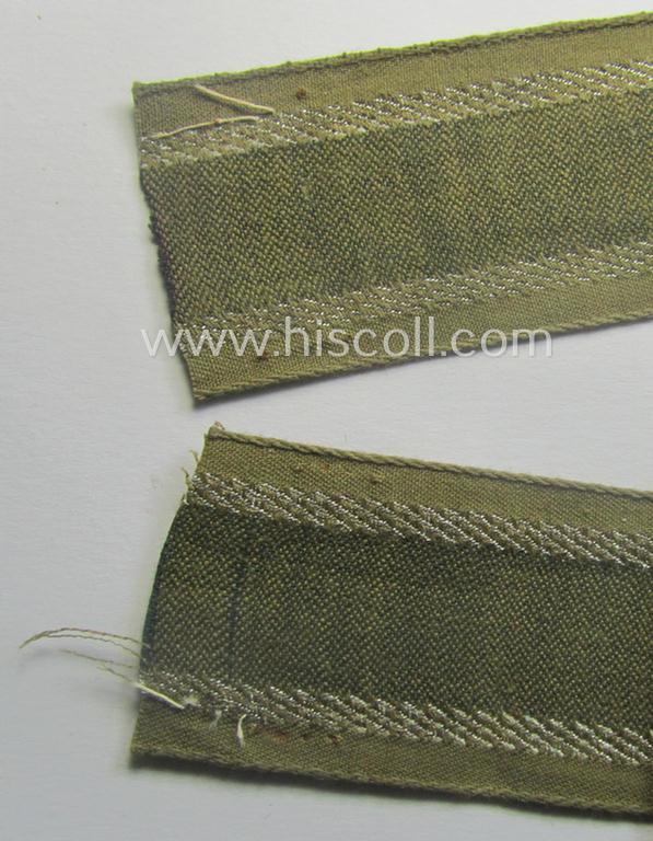 This is a truly very attractive - presumably issued but simply never worn nor tunic-attached! - example of the typical 'BeVo'-like cuff-title (or: 'Ärmelstreifen') entitled: 'Afrikakorps' as was executed in so-called: 'flat-wire'-type, silver-coloured 'braid' as interwoven on a rust-brown- (ie. darker-green) coloured background and that comes in an overall very nice- (ie. never used- ie. 'virtually mint- ie. unissued'-), condition. The attractive piece is as stated above totally non-shortened and measures approximately 44 cms. in length (as can be seen on the pictures). As usual, are both ends 'unfinished' and do show some normal fraying as to be expected. This example was stored as such for years by the veteran to whom it was issued. As most certainly known are these 'Afrikakorps'-cuff-titles copied at a large scale: this is naturally a 100% original item that shows the various details as such (as can be seen on the pictures). The piece was never cleaned and shows some age and/or staining simply caused by decades of storage only: it was never part of a collection before and came as such from a private-household in Germany. Simply a very attractive - and truly 'virtually mint- ie. unissued'! - example of this desirable 'BeVo'-like 'Afrikakorps'-cuff-title!