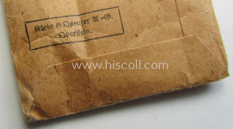 This is a very attractive example of a: 'Kriegsverdienstmedaille 1939' (or: War Merits'-medal 1939) being a typical, non-maker-marked- and/or golden-bronze-toned- (and 'Buntmetall'-based!) specimen that came together with its (truly bright-red-coloured, regular-sized- ie. 19 cms. long-sized and unconfectioned) ribbon and reddish-brown-coloured 'Zellstoff'-based pouch by the (for this award unusually seen!) maker: 'Klein & Quenzer A.G.' as was based in the town of Oberstein and that comes as issued and/or recently found. The award was presumably issued but was simply never worn nor used (nor even mounted): it has an attractive (darkened) golden-bronze-coloured age-patina and was most certainly never cleaned nor polished and therefore are details and/or finish still very nice and/or crisp. The piece - that came with its piece of thin-shaped 'wrapping-paper' as packed - is just a bit tarnished and stained but was never cleaned (as can be seen on the pictures). Simply a neat - and fully complete! - example of a: 'Kriegsverdienstmedaille 1939' (or: War-Merits'-medal 1939) that will be very hard to be upgraded!