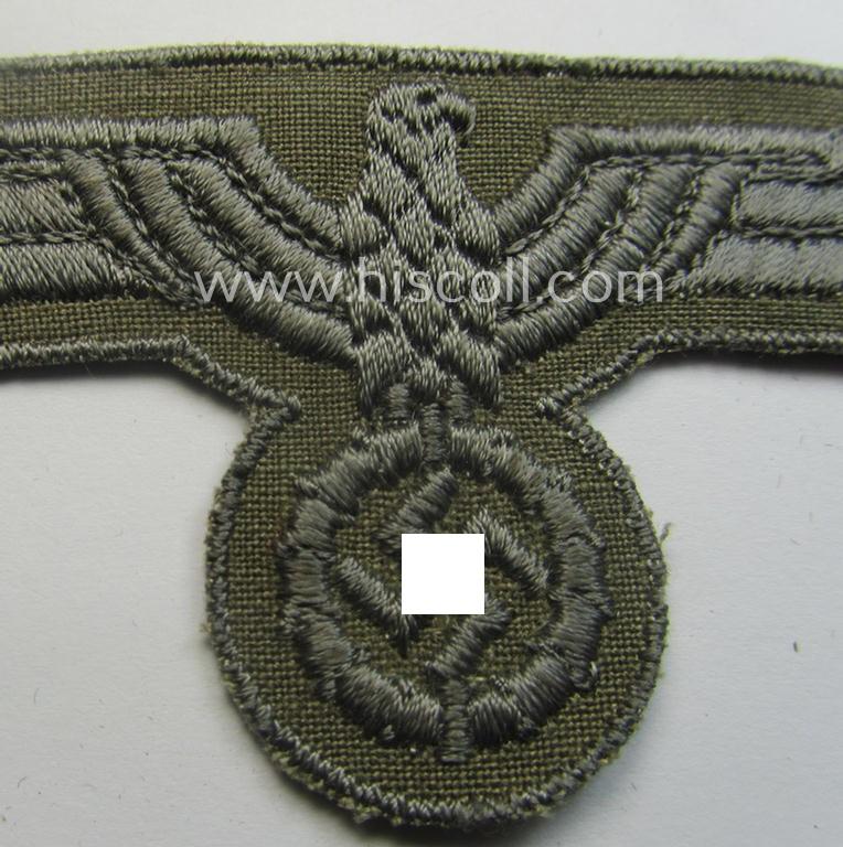 This is a neat - and with certainty never used- nor tunic-attached! - example of a later-war-pattern, WH (Heeres) breasteagle (ie. 'Brustadler für Mannschaften u. Unteroffiziere') being of the 'last-ditch'- (ie. later-war-period-) and neatly machine-embroidered-pattern and that comes in an overall very nice- (ie. 'virtually mint- ie. unissued'-), condition. These (somewhat roughly-embroidered) versions of the 'standard-pattern' army-type breasteagle were introduced in late 1944 ie. beginning 1945 and saw only limited usage. They are sometimes found on the - battle-dress like-model-, so-called: '1944-type' Heeres tunics. The piece on offer here comes in a simply never used example that just shows some minimal storage-age only (as can be seen on the pictures). Simply a neat - and not that easily encountered! - WH (Heeres) breast-eagle that comes in a truly wonderful condition!