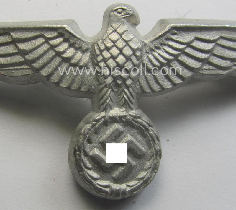 This is an attractive - and nowadays actually not that easily encountered! - WH (Heeres) (very bright!) silver-toned (ie. typical aluminium-based), enlisted-mens'- (ie. NCO- or even officers') type visor-cap-eagle (ie. 'Adler für Schirmmütze') being a detailed albeit non-maker-marked example that comes in a just moderately used- ie. once visor-cap-attached, condition. The neat - and minimally 'vaulted'! - piece comes (of course) in a still fully functional condition. It retains all its three (somewhat broader-shaped, aluminium-based) prongs firmly in place: which were - I deem - once folded ie. bent and that are of course still functional (as can be seen on the pictures). The eagle - which is very detailed and pronounced - has a nice typical, aluminium-like appearance as to be expected. Simply an attractive - and with certainty desirable! - spare-part that is accordingly priced!