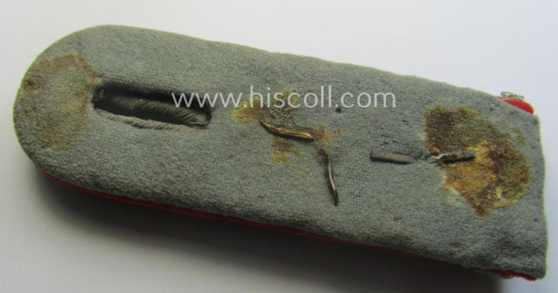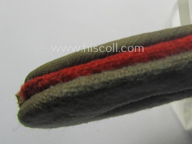 This is an attractive - clearly used and regrettably single but nevertheless quite scarcely encountered! - WH (Heeres) neatly 'cyphered', officers-pattern shoulderboard having the (bright!) red-coloured branchcolour and that has the typical dove-grey-coloured 'underlay' (ie. secondary branchcolour) as was specifically intended for usage by a: 'Hauptmann der Reserve u. Feldingenieur des Heeres' (or: reserve captain and field-engineer) and that comes in an overall nice- (albeit I deem moderately used ie. worn- and/or I deem carefully tunic-removed-), condition. The shoulderboard which is approximately 10,3 cms. sized in length and that is piped in the (bright!) red-coloured (ie. 'hochroter'-) coloured branchcolour (and having the typical dove-grey-coloured 'underlay' ie. secondary branchcolour) as to be expected shows a neat (bright golden-coloured, 'Buntmetall'-based, larger-sized and unsually KM-type!) so-called: 'cogwheel'-cypher (ie. 'Ziffer') and two (equally-styled and larger-sized) pips period-attached denoting that the strap was intended for a (reserve) officer who held the rank of a: 'Hauptmann' (ie. captain). All three devices show some regular age and/or minimal tarnish but are both still nicely preserved. The strap never had a tongue attached (it is a typical specimen of the 'sew-in'-type) and does show some minimal age, wear and/or staining (as can be seen on the pictures). The piece was never before in collectors'-hands and was recently found as such. Simply an attractive 'Heeres' officers'-type shoulderstrap that belonged to a: 'Hauptmann der Reserve u. Feldingenieur des Heeres': too bad that it is only a single specimen!