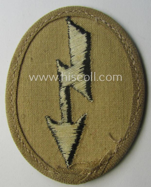 This is a neat WH (Heeres) 'tropical-styled', trade- and/or special-career insignia (or: 'Signal Blitz') as executed in machine-embroidered black- (ie. 'schwarzer'-) coloured linnen as was intended for usage by a soldier (ie. NCO) who served within the: 'Pionier-Truppen' (or: simple soldier ie. NCO who served within one of the various engineer-troops) and that comes in an overall very nice- (ie. simply never used ie. 'virtually mint- ie. unissued'-), condition. The patch is a non-maker-marked example that shows a nicely reinforced border but is void of an additional backing: it does show some minimal age ie. staining simply caused by decades of storage only (as can be seen on the pictures). Simply a nice occasion to acquire a 'virtually mint', 'tropical-issue' ie. DAK- (or 'Deutsches Afrikakorps'-) related: 'Signal Blitz' as was intended for the: 'Pionier-Truppen'!