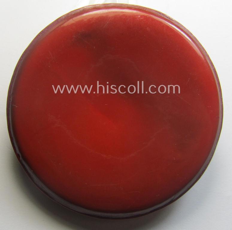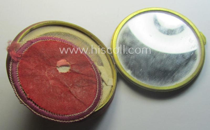 This is an attractive - and with certainty unusually seen! - female-related, TR-period so-called: 'souvenir'-item (ie. powder-box) being an attractive example that shows a detailed illustration of the huge German pavillon (with large 'Reichseagle'-device on its top!) at the in 1937 held world-fair (ie. 'Exposition Internationale - Paris - 1937') and that comes in a fully complete- (ie. still functional!), condition. The piece - which is I deem constructed from typical sheet-metal (ie. 'Eisenblech') - has an undamaged mirror in place and comes with its period 'pad' as issued and/or used. The piece shows a producers'-logo on its front (that reads: 'CH' as can be seen on the pictures). The piece does show some obvious wear-marks and age (ie. is somewhat 'dented') but is void of any real damage or alike (as can be noticed on the pictures). Simply an attractive, patriotic-styled, period 'souvenir-pieced' that was acquired in 1937 and that can be easily described as an example of typical 'Nazi-Kitsch'!