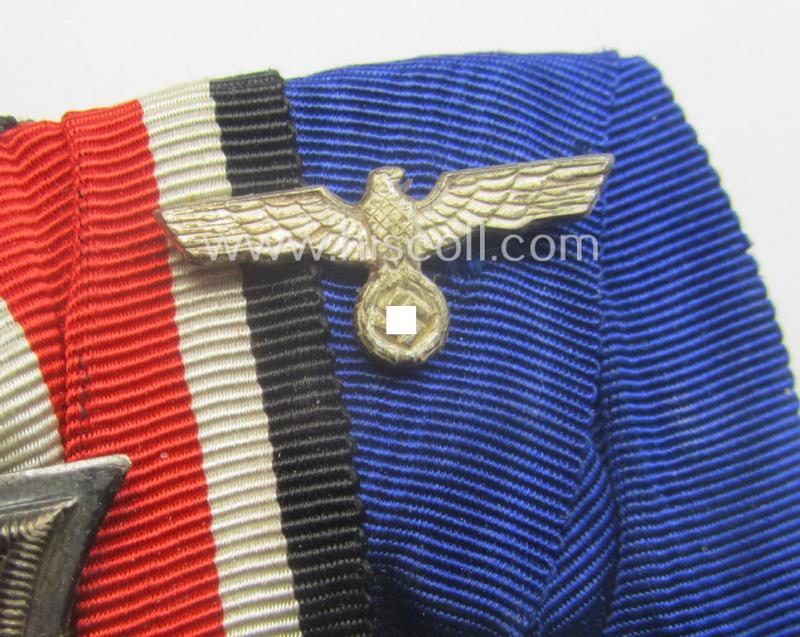 This is a truly very attractive - and with certainty desirable! - WWII- (ie. TR-) period, 2-pieced WH (Heeres o. KM etc.) medal-bar (ie. 'Orden- o. Doppelspange') that respectively shows an: 'Eisernes Kreuz II. Klasse' (or: iron-cross second class) as was executed in the so-called: 'Schinkel'-pattern by (I deem the maker: 'Wilhelm Deumer') and a: 'WH (Heeres o. KM) Dienstauszeichnung 4. Stufe' (as was intended for 4 years of loyal-service) and that shows a detailed, bright-silver-toned eagle-device period-attached both medals coming in an overall very nice- (albeit moderately used and/or worn-), condition. Both medals are nicely preserved examples that seem to have never been cleaned nor polished: both come in an equally minimally tarnished- ie. dusty condition and naturally also come mounted onto their period ribbons. The iron cross - which is an attractive (and early war-period!) example of the so-called: 'Schinkel'-pattern by (I deem) the maker: 'Wilhelm Deumer' - was with certainty never cleaned and has a very nice and/or attractive age-patina: it has just a minimally tarnished appearance (as can be seen on the pictures). The cross retains truly very nice and/or pronounced detail and has a very nicely preserved, black-finished (ie. somewhat 'matted'- ie. satin-like) core: it is void of any damage (as can be noticed on the pictures). The 'WH-Dienstauszeichnung 4. Stufe' retains nice details and has a great ie. only minimally darkened- ie. tarnished age-patina: it retains all of its somewhat 'bright'- and/or: silver-toned finish (as can be noticed on the pictures). The 'Ordenspange' comes naturally mounted onto its functional pin- (ie. catch-) set-up and is neatly 'backed' with a piece of darker-blue coloured wool that shows a neat distributors'- (ie. maker) 'tag' that reads: 'Wolfg. Rob. Schwarz - Direkt an Weddingpl. - N65 Müllerstr. 175 - DG.Weddg. 7463' (as can be seen on the pictures). The medal-bar was recently found at a private-household in Germany and was never before part of a collection. The 'Spange' is most certainly a period-compiled- and/or worn piece and is NOT a post-war compilation or alike: it originated as stated above from a private-household and was kept as such for decades. Simply a very attractive - and most decorative! - 2-pieced, WH (Heeres o. Kriegsmarine) related medal-bar- ie. 'Orden- o. Doppelspange' that is in my opinion with certainty accordingly priced!