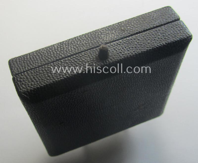 This is an attractive - and with certainty not that often encountered! - typical greyish-silverish-toned (and zinc- ie. 'Feinzink'-based) so-called: 'Reichsnährstand'- (ie. 'RNSt.'-) related, commemorative-award-plaque (ie. 'nichttragbare Auszeichnungs-Plakette') entitled: '5. Reichsnährstands-Austellung - Blut und Boden - Leipzig 1939' (and on its back mentioning the class being: 'Rohmilch') and that comes stored in its period, black-coloured period-etui as issued and kept ie. stored as such for decades. The table-medal (that was apparently awarded for outstanding achievement in a by the 'Reichsnährstand'-organised farmers'-contest held in the year 1939) comes stored in its period etui (ie. 'Verleihungsetui'). The neat - smaller-sized- and regular-weight-piece that shows a 'Reichsadler' and 'Reichsnährstand'-device on its front - has an approximate diameter of 4 cms. and has very pronounced detail as to be expected. It was most certainly never cleaned nor polished and has maintained a neat (somewhat matted- ie. frosted-) greyish-silver-toned age-patina (as can be seen on the pictures). The black-coloured (and square-shaped) etui - comes in an equally nicely preserved condition and shows a (fully preserved) silver-toned 'RNSt.'-logo on its top (as can be seen on the pictures). The piece originates from a private-household in Germany where it was recently uncovered as issued and stored for decades. Simply an attractive, complete - and with certainty unusually encountered! - 'Reichsnährstand'-related table-medal ie. 'Erinnerungs- o. nichttragbare Auszeichnungs-Plakette' that is with certainty accordingly priced!