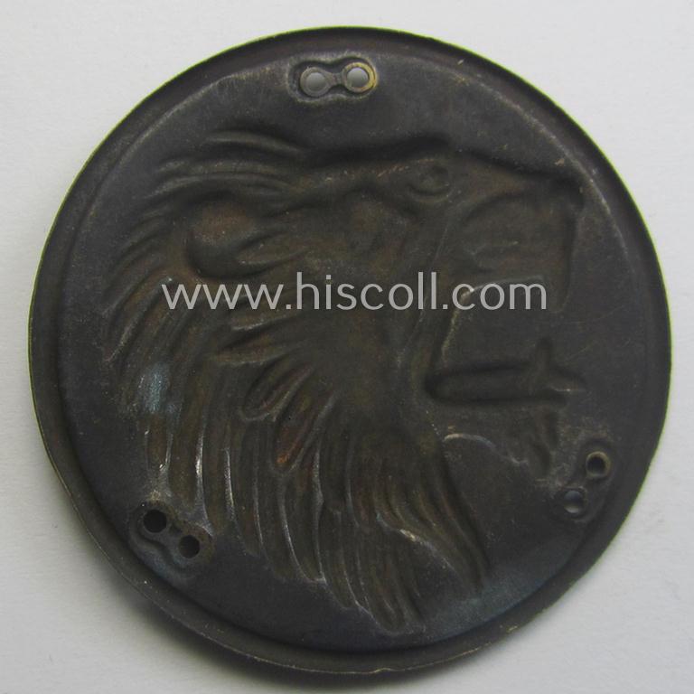 This is a very attractive - and actually truly scarcely encountered! - so-called: 'Freikorps'- (ie. 'Ritter von Epp'-) related sleeve-diamond device (ie.: 'Auflage für den Ärmelraute') showing a very detailed illustration of a lions-head (ie. 'Löwenkopf') and that comes in an overall very nice- (ie. I deem just moderately used- and/or carefully tunic-removed-), condition. The piece is executed in golden-bronze-toned metal (I deem non-magnetic so-called: 'Buntmetall') and is truly very detailed and pronounced (as can be noticed on the pictures). These device were normally worn on a black- (ie. darker-blue) toned and/or woolen-based 'Raute'. These attractive Bavarian-related sleeve-diamonds (ie.: 'Ärmelrauten') were worn by the various 'Freikorps Ritter von Epp'-volunteers during the period between 1919 and 1925. Simply a an attractive - and truly scarcely seen! - early-period piece of 'Freikorps'-related insignia: only the second such interesting 'Freikorps-Raute Auflage' I ever had on offer!