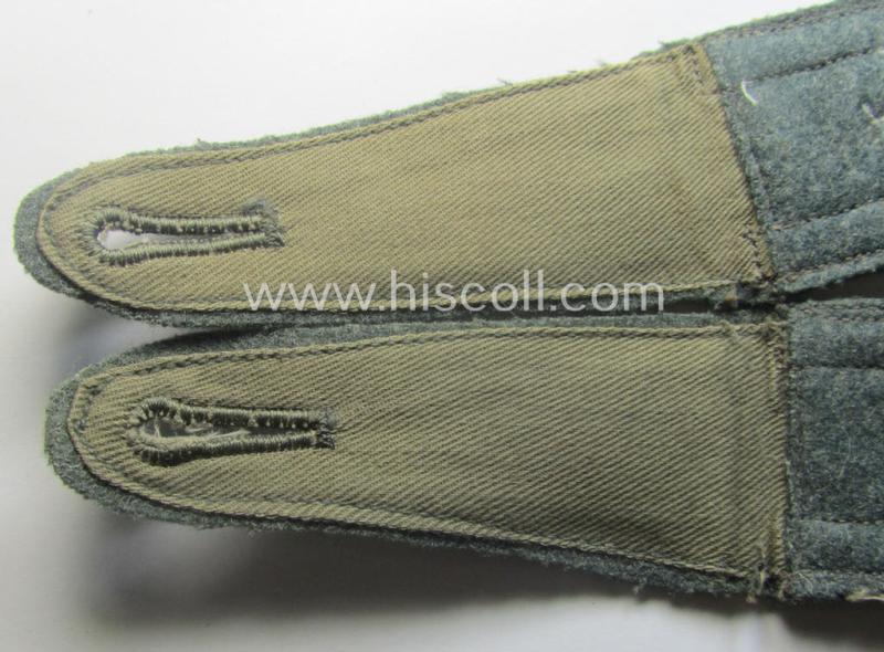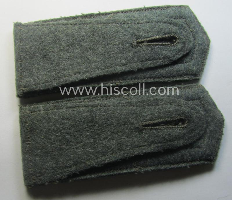 This is an attractive - fully matching and actually fairly rarely encountered! - pair of (I deem) early-period (ie. 'Reichswehr'-era and/or 'pointed-styled'), WH (Heeres) 'cyphered' NCO-type shoulderstraps (being of the generic-pattern having no piping attached as per regulation) as executed in the neat field-grey-coloured-wool as was specifically intended for - and with certainty used by! - an: 'Unteroffizier des Infanterie-Regiments 4' (or: junior-sergeant who served within the infantry-regiment, numbered: '4') and that comes in an overall very nice- (albeit just moderately used ie. worn-), condition. The straps - which measure 11,5 cms. in length each - are fully 'text-book' in all facets and are executed in (typical 'Reichwehr'-era pattern!) wool and having no piping attached. The straps come naturally mounted onto their functional, tongues attached and do show the (greyish-blue-toned, 'dotted'-style) NCO-braid: moreover, do they show the white- (ie. 'weisser'-) coloured '4'-cyphers (ie. numerals or: 'Ziffern') which are executed in so-called: 'Kurbelstickerei' as to be expected (as can be seen on the pictures). These type of (early) shoulderstraps are of the pre- ie. early-war-period pattern straps and were (I deem) worn in the period around 1935/1937 and were worn-out during the war. The pair only shows moderate wear and/or age and is just nicely preserved over the years (as can be seen on the pictures). Simply an attractive - and with certainty quite rarely encountered! - 'cyphered' shoulderstrap-pair that belonged to an: 'Unteroffizier des Infanterie-Regiments 4' and that is (I deem) accordingly priced!