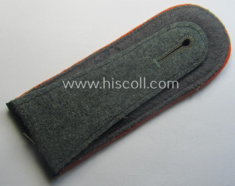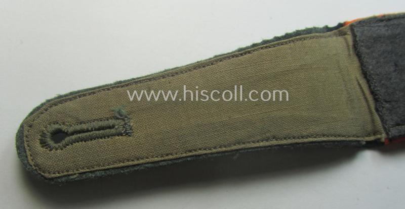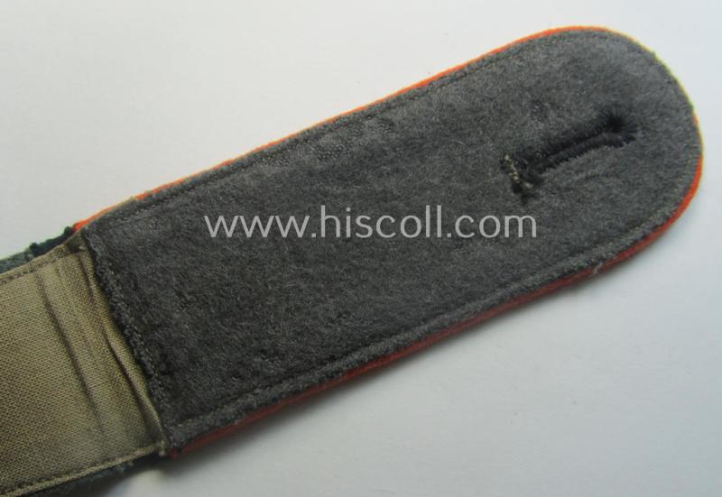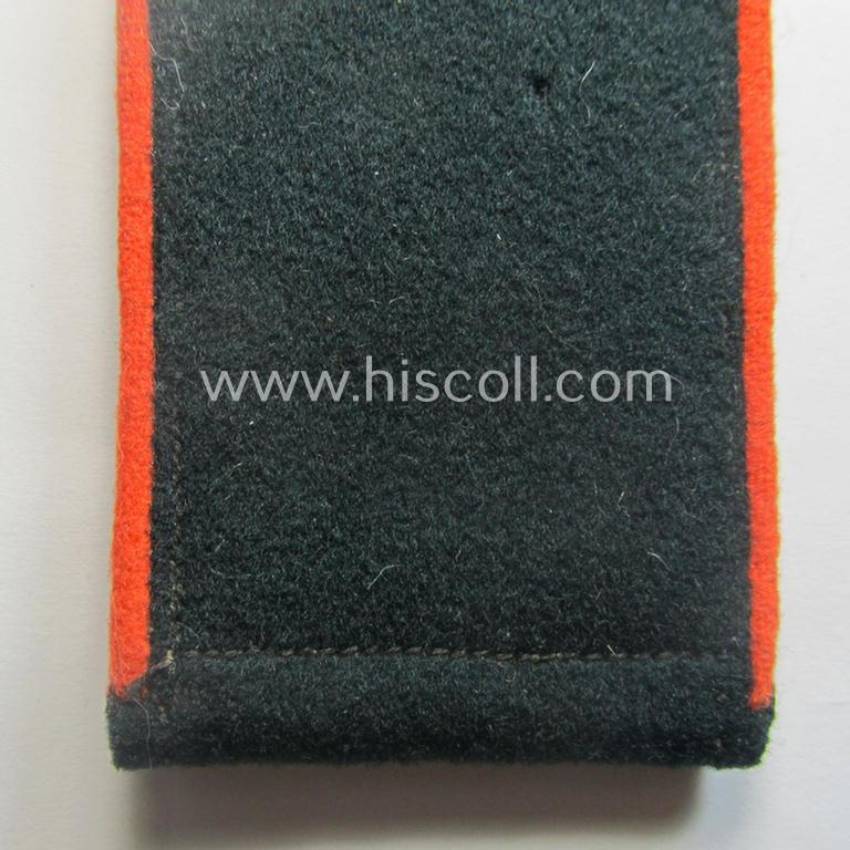 This is an attractive - albeit regrettably single but nevertheless not that often encountered! - early- (ie. pre-war-) period- (ie. 'M36'-pattern- and/or rounded-styled-) WH (Heeres) enlisted-mens'-type shoulderstrap having the bright-orange- ('orangeroter'-) coloured branchcolour as was intended for - and most certainly worn by! - a: 'Soldat einer Wehr-Ersatzdienstelle' (or: 'Feldgendarmerie'-unit) (or: simple soldier who was part of the recruitment-troops or evt. field-police unit) and that comes in overall very nice- (albeit issued ie. moderately worn-), condition. The shoulderstrap - which does show some regular age ie. wear and/or minimal staining caused by moderate usage - comes in an overall nice, albeit moderately used- and/or worn condition but is void of any damage whatsoever. The strap is executed in the darker-green-coloured- (and/or: 'smooth'-type) wool and has the woolen-based- and bright-orange- ('orangeroter'-) coloured piping attached. The neat shoulderstrap - which came mounted onto its period tongue attached - measures approximately 12,2 cms. in length denoting the soldiers' rank ie. function of: 'Soldat einer Wehr-Ersatzdienstelle o. Feldgendarmerie'. I deem that I have priced this neat, bright-orange-piped EM-shoulderstrap according to its evident desirability and/or comparative rarity!