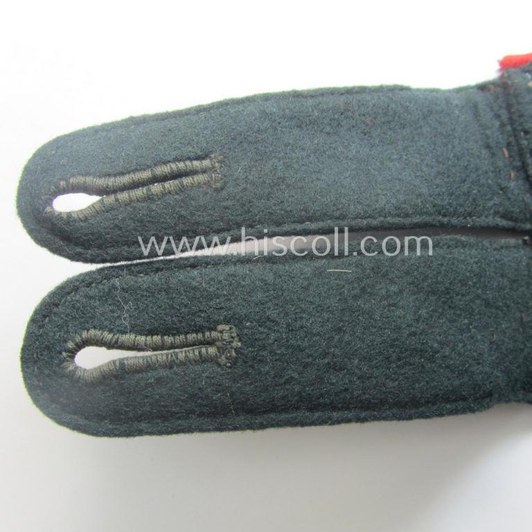 This is an attractive - just moderately used and/or fully matching! - pair of non-'standard-issued'- (ie. privately-purchased ie. 'tailor-made'-) pattern, WH (Heeres) early-war period- (ie. 'M40'-pattern and/or: rounded-styled) NCO-type shoulderstraps (ie. 'Schulterstücke für Unteroffiziere des Heeres') as was piped in the desirable bright-red- (ie. 'hochroter'-) coloured branchcolour as was specifically intended for usage by an: 'Wachtmeister o. Feldwebel eines (Sturm)Artillerie-Abteilungs o. Regiments' (or: sergeant who served within an artillery unit or regiment) and that comes in an overall nice- (ie. just moderately used- ie. worn-), condition. The neat straps - which have the 'standard'-pattern, darker-green-coloured- and/or typical 'smooth woolen'-based 'upperdecks' and that measure approximately 11 cms. in length each - show the neat bright-red- (ie. 'hochroter'-) coloured and/or woolen-type piping attached (as can be seen on the pictures). The straps - that show the typical silverish-toned NCO-braid and a pair of zinc-based pips period-attached denoting the NCOs-rank of a: 'Wachtmeister o. Feldwebel' - come mounted onto their period (and also entirely woolen-based) tongues and come both in an overall nice- and/or just moderately used condition (as can be seen on the pictures). Simply an excellent occasion to acquire a neat NCO-type, '(Sturm)Artillerie'-related shoulderstrap-pair for an I deem justified price!