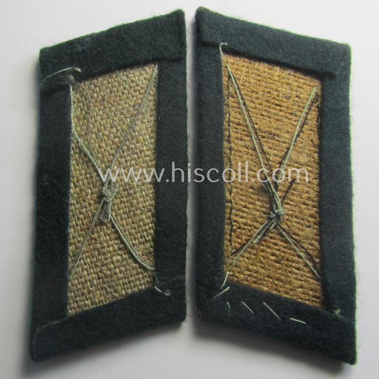 This is an attractive - and matching! - pair of WH (Heeres) I deem early- (ie. mid-) war-period- and/or: 'standard-issue'-pattern, WH (Heeres) collar-tabs (or: 'Einheitskragenspiegel') being of the 'generic-pattern' (that come pre-mounted onto a (somewhat simplified) green-toned and woolen-based background) and that comes in an overall very nice- (and I deem simply never used- nor tunic-attached-), condition. These desirable WH (Heeres) enlisted-mens'- (ie. NCO-) type collar-tabs (ie. 'Einheitskragenspiegel') are piped in the typical, dark-green-coloured (ie. 'generic'-styled) branchcolour and have an equally darker-green-coloured 'centre-stripe' and that were as such intended for usage by all soldiers (ie. NCOs) within all 'Heeres'-related branches of the: 'Deutsche Wehrmacht' throughout the war. The tabs come in an overall very nice condition and were (I deem) simply never used (as can be seen on the pictures). The set just shows some minimal age and/or staining and came 'off-factory'-mounted onto a piece of (smooth-based) darker-green-coloured wool. The pieces show the typical, brownish-coloured- and/or buckram-based 'backings' as is more often seen. Simply a neat occasion to acquire such a pair: great to complete any WH-tunic or to be simply stored in any insignia-collection: it should be noted that these 'generic'-styled EM- (ie. NCO-) type pairs are nowadays fairly hard to encounter and are most certainly not that often offered for sale!