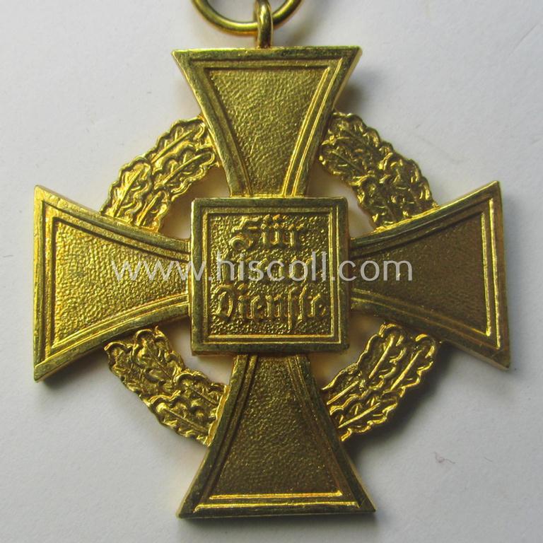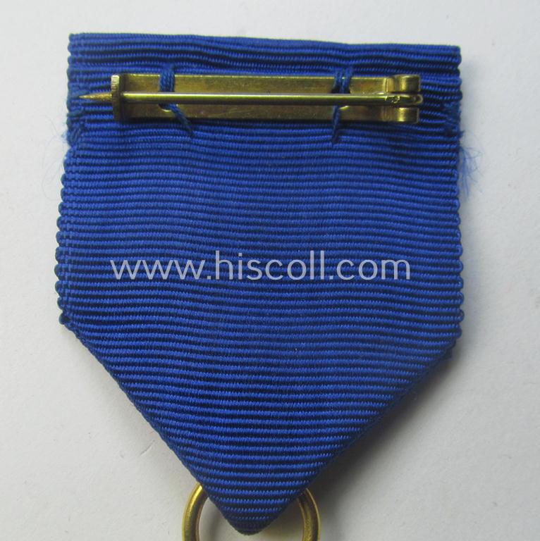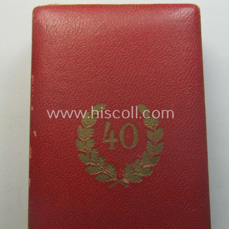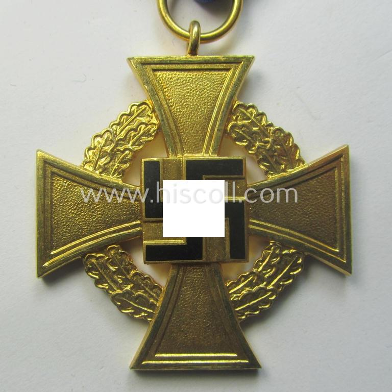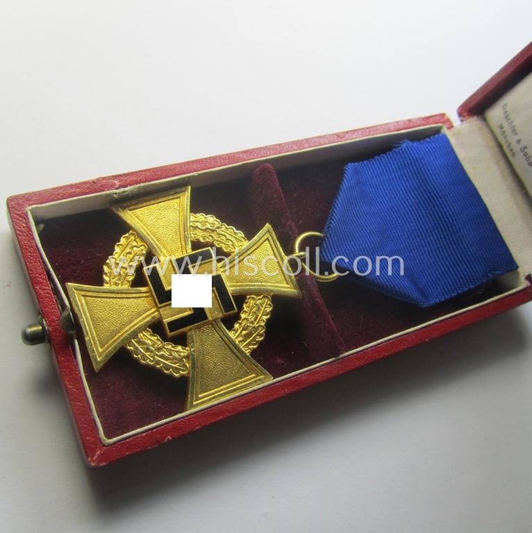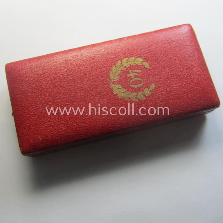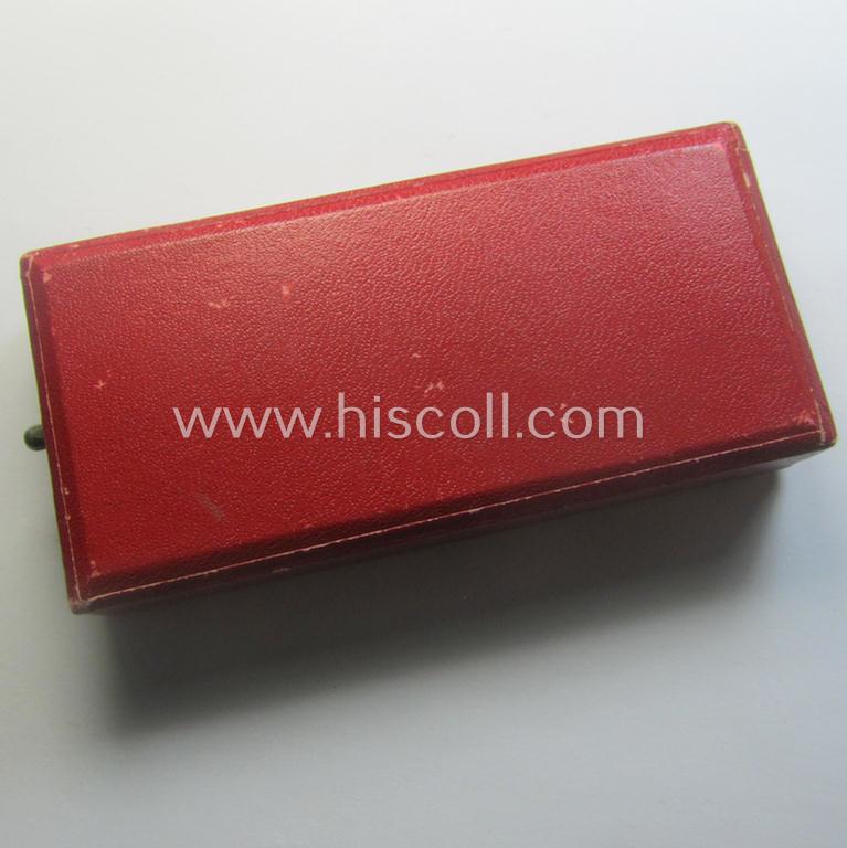 This is an attractive - and I deem just minimally used ie. worn - example of a so-called: 'Treuedienst Ehrenzeichen 1. Klasse' (or: golden-class, loyal-service-medal for 40 yrs. of loyal civil-service) being a (typical) non-maker-marked example that comes mounted onto its original ribbon (ie. 'Bandabschnitt') and that comes stored in its neatly maker- (ie. 'Deschler & Sohn - München') marked etui as issued and/or recently found. The medal is a truly attractive piece that truly retains all of its period, bright-golden-coloured- and/or fairly 'frosted' finish: it also retains most (ie. all!) of its 'off-factory applied': 'hochpolierte Kanten' (or: polished sides) but is just a tiny bit stained (it has never been cleaned). It comes mounted onto its cornflower-blue-coloured ribbon which still has its period (golden-toned) attachment-pin in place as was intended for wearing the medal on a tunic. The medal has never been cleaned and has an immaculate (ie. fully undamaged!) enamelled swastika(area). The medal came stored in its original, bright-red-coloured etui (as can be seen on the pictures). This etui is fully undamaged but does just show some minimal (handling ie. storage-) age and/or minimal staining (as can be seen on the pictures). Simply a very attractive example of an: 'Treuedienst Ehrenzeichen 1. Klasse' that will be hard to be upgraded!