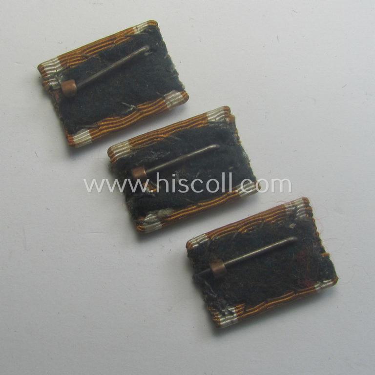 I recently found three - fully identical! - TR-period so-called: 'Feld-/Bandspangen' (ie. single-pieced ribbon-bars) that came all three in an overall nice- (ie. I deem minimally used- ie. worn-), condition. The items offered here are the 'standard' (ie. regular-shaped!) one-pieced ribbon-bars (ie.: 'Feld- o. Bandspangen') as were intended for the: 'Deutsches Schutzwall Ehrenzeichen' (aka: 'Westwall'-medal). The pieces are of the regular- (ie. 2,5 cms. wide-sized-) version and are all neatly 'backed' with a piece of typical greenish-black-coloured- and/or woolen-based material (as can be seen on the pictures). The bars come in an overall nice condition and are naturally fully functional. I can offer them for an atractive and competitve price (they are of course priced per single piece!). Simply a neat medal-accesory that is I deem accordingly priced!