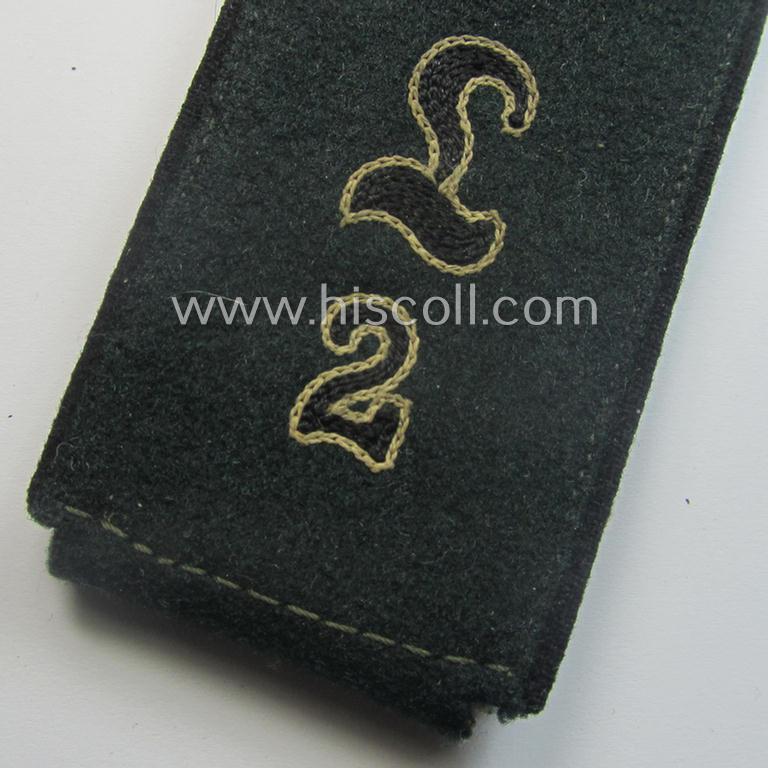 This is a truly attractive - very desirable albeit regrettably single but nevertheless truly rarely found! - example of an early-period (ie. 'M40-pattern and/or rounded-styled and black- ie. 'schwarzer'-piped) WH (Heeres) 'cyphered', enlisted mens'-type shoulderstrap as was specifically intended for usage by a: 'Soldat u. Mitglied des Pionier-Lehr-Regiments 2' (or: simple army-engineer-soldier who served within a specific 'Pioniere' training- ie. schooling-unit, numbered: '2') and that comes in an overall very nice- (ie. just moderately used- ie. worn-), condition. The neat strap - which is executed in the darker-green-coloured wool as to be expected - has the neat black- ie. 'schwarzer'-coloured and/or woolen-type piping attached. The strap measures approximately 10,2 cms. in length and comes mounted onto its original (albeit I deem period re-attached) tongue. It shows the neat (machine-embroidered by means of so-called: 'Kurbelstickerei'), Gothic-styled: 'L'-cypher (or: 'Ziffer') and dito '2'-numeral attached (which are executed in the black- ie. 'schwarzer'-coloured - and white-piped! - wool ie. linnen as to be expected). The strap - which is of the typical 'standard-issued'-pattern - shows as stated above only moderate usage and wear (just some minimal age, dust and/or staining is visible and/or present). This particular example originated from a small but wonderful collection of rarely seen 'cyphered' shoulderstraps I recently acquired for the web-site. It should be noted that ALL 'cyphered', enlisted-mens'-pattern, 'Pioniere-Lehr'-type shoulderstraps can easily be regarded 'rare' and come not that often for sale. In any case a very attractive and early-war-period, 'Heeres-Pioniere-Lehr'-related, EM-type shoulderstrap that was intended for usage by a: 'Soldat u. Mitglied des Pionier-Lehr-Regiments: too bad that it is only a single specimen!
