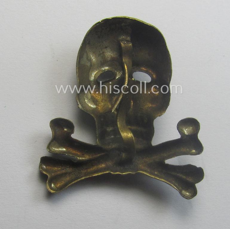 This is an attractive - and actually quite scarcely encountered! - so-called: 'Truppentraditionsabzeichen' (ie. 'Braunschweiger Traditions-Totenkopf für die Schirmmütze des Infanterie-Regiments 17 und Kavallerie-Rgts. 13) being a detailed example as was executed in silverish-grey-coloured (and I deem) 'Buntmetall'-based metal and that comes in an overall very nice- (ie. I deem just moderately used- and clearly once visor-cap attached-), condition. The piece - which is totally void of any makers'-designation as more often - came mounted on both its (still fully functional) copper-toned prongs (as can be seen on the pictures). The piece is just a tiny bit stained- ie. dirty but was never cleaned nor polished. Simply a very attractive - and naturally 100% genuine! - 'Truppentraditionsabzeichen' (ie. 'Braunschweiger Traditions-Totenkopf') that is with certainty accordingly priced!